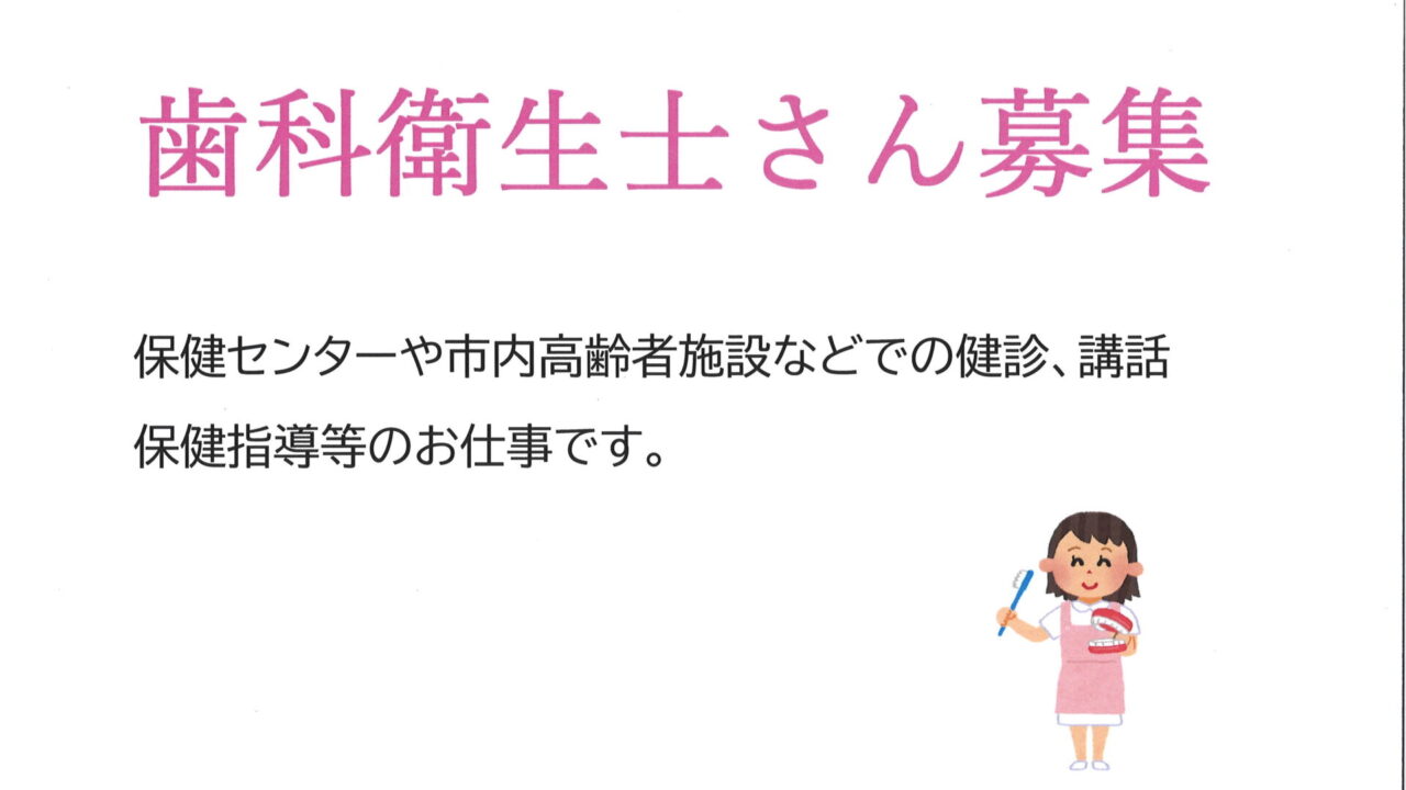 就業時間は事業により異なります。例:①1歳6カ月児・親歯科健康診査9:00~12:00②3歳児歯科健康診査13:00~16:00③デイサービス口腔ケア教室17:30~18:30